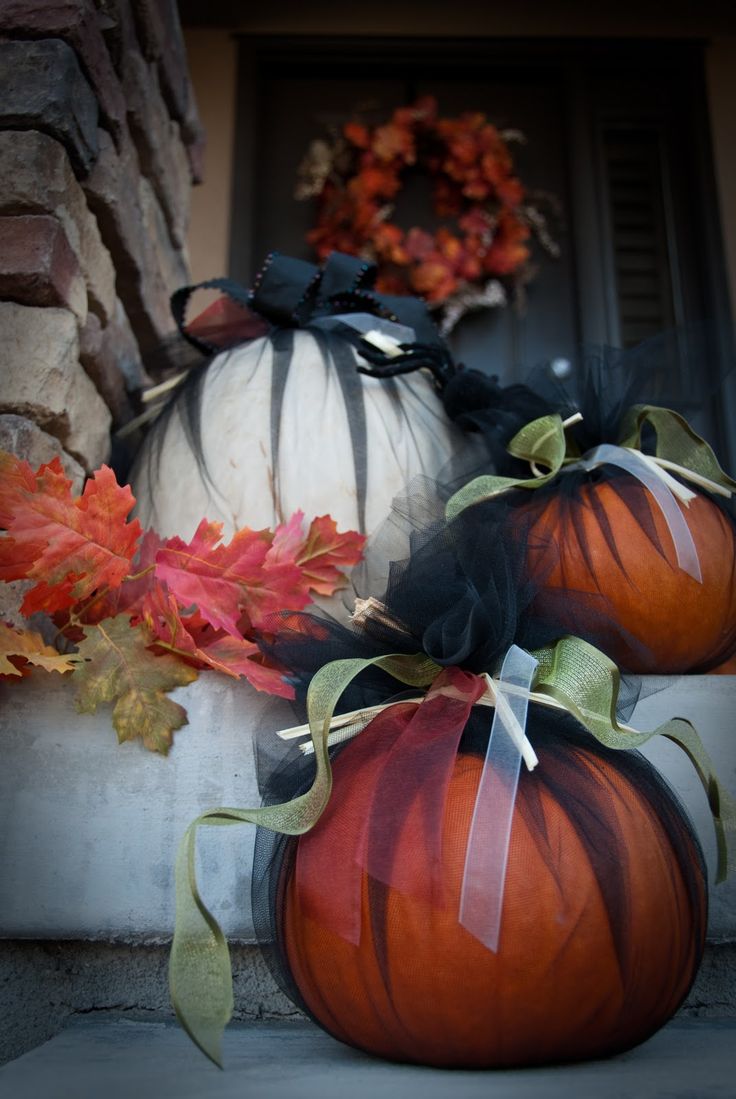 Try wrapping your pumpkins in black tulle and tying some seasonal ribbons on the stem for this sophisticated look: